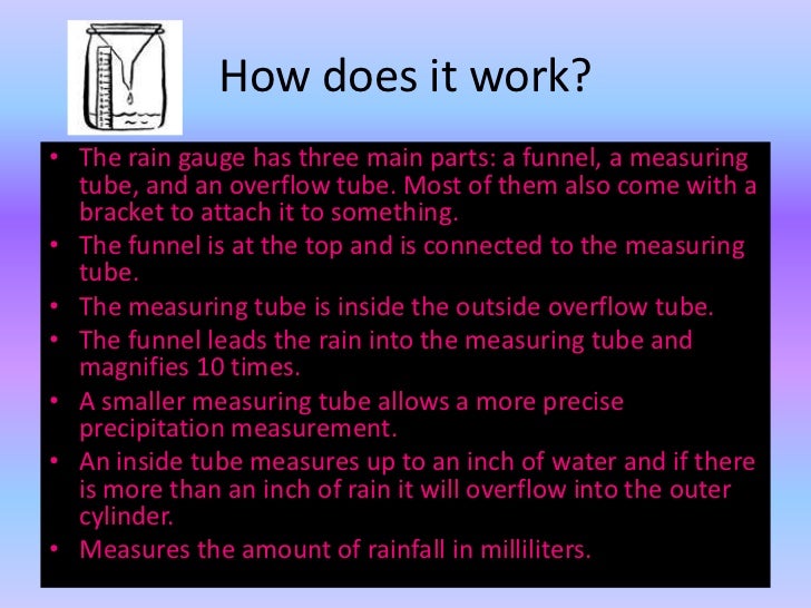 Rain gauge pd3 from image.slidesharecdn.com How do you measure rainfall? A rain gauge helps you to know exactly how much it is raining. The measurement is done by visual irregularities. A rain gauge works by first making sure it rained, and seeing how many inches the rain filled up the rain gauge. It is the most common variety of rain gauge due to its ease of use and reliability. Rain gauge is a meteorological instrument for determining the depth of precipitation (usually in mm) that occurs over a unit area. A rain gauge is a meteorological instrument to measure the precipitating rain in a given amount of time per unit area. Each type of gauge performs its primary function of measuring rainfall and a few distinctive functions.